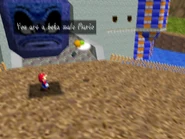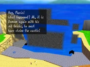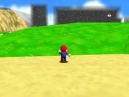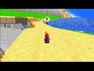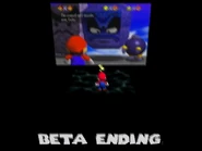 This ending is achieved by choosing the parts that use assets from the beta version of Super Mario 64, such as the dull dirt path, smooth brick walls, clock face and tiny windows. After doing so, the screen will suddenly develop a doubling effect before Lakitu calls Mario a beta male and has him crushed by a Thwomp, thus sending him to the Beta Ending room. Here, Mario appears identical, but his sound effects have been replaced with their beta equivalents.