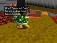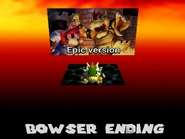 This ending is achieved by picking the parts that are the most reminiscent of what one may see at Bowser's Castle, such as the dark textures, the lava moat, and of course, Bowser's portrait. After doing so, Lakitu will accuse Mario of actually being Bowser and call for all of the Toads to evacuate the Castle. Bowser-Mario (Bowsario?) then proceeds to breathe a load of fire around before being warped to the Bowser Ending room. Here, Bowser-Mario is playable, albeit stuck in a permanent running animation whenever he is stationary.