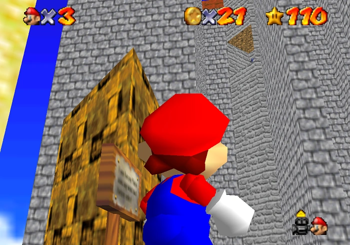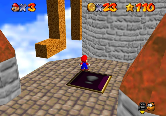 - From here, jump across the path and through the Chuckyas. Mario must use the Fly guy to glide to the top of the building where the coin is. If the Fly Guy dies, Mario must do a triple jump and then immediately jump to the roof before sliding off.