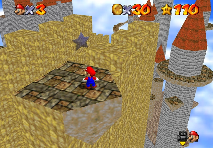 Mario must again use his wall kicking skills to get through a gauntlet to reach the star. Wall kick from the top of the first wall to reach the left tower of the castle. From here, follow the path and then long jump to yellow wall across from it. Pass the Kuromame and jump into the hole in the grey wall. From this ledge look to your right, and you should see another ledge that Mario can long jump to. Before you make the next jump, make sure you have at least 5hp. Now, Mario must perform a wide angled long jump to the next wall, then wall kick off that, through the passage, in order to fall on some tan blocks quite a distance away. In order to get higher from here, Mario must perform triple jump wall kicks and then grab the edge of the next two blocks. However, this method will next work for the next one (indicated by an easy to see slope in front of you and the ability to see the tan roof during the last jump). To reach the next block, Mario must wall kick off the left side of the wall to get enough height. He must then do it again to reach the top of the Bottomless Fortress.