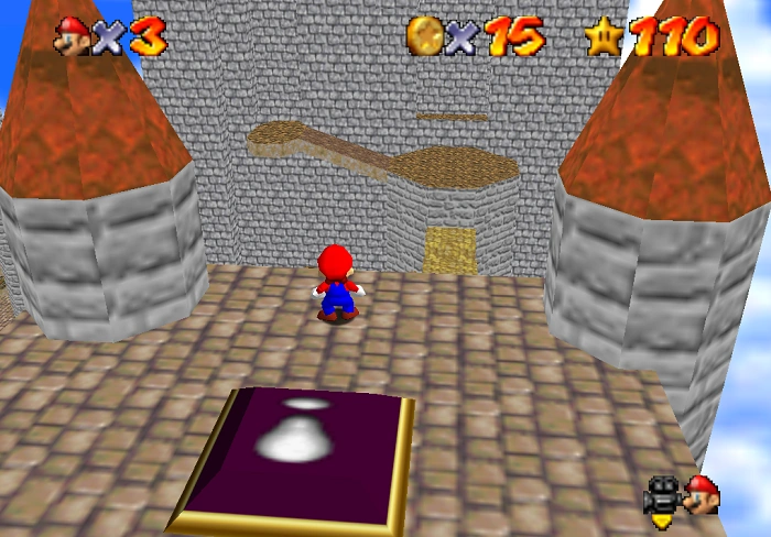 Mario must reach one of the high towers of the palace and then use a timed switch button to ascend it using difficult wall kicks. Mario starts in the dead center of the castle, surrounded by paths by all four sides. Start by climbing the tan wall directly in front of Mario, which is past the sign. From the top of this wall, Mario must wall kick to the top of the next wall. This can be done by doing an angled jump on the side towers. Alternatively, Mario can drop down to the platform bellow and performing a triple jump to ascend the wall, but from this platform, Mario must wall kick up a grey tower to reach the section required. Walk all the way to the left end of the wall and follow the path to a purple "!" switch. From this a tricky looking set of blocks will spawn off the edge. Mario must break a couple of the blocks to make a space to long jump and wall kick off the two sets of blocks. If you make it to the top, quickly jump to the ledge of the tower before the blocks disappear and claim the star.