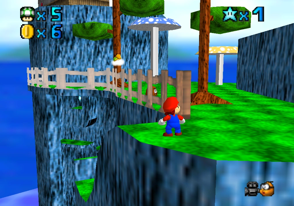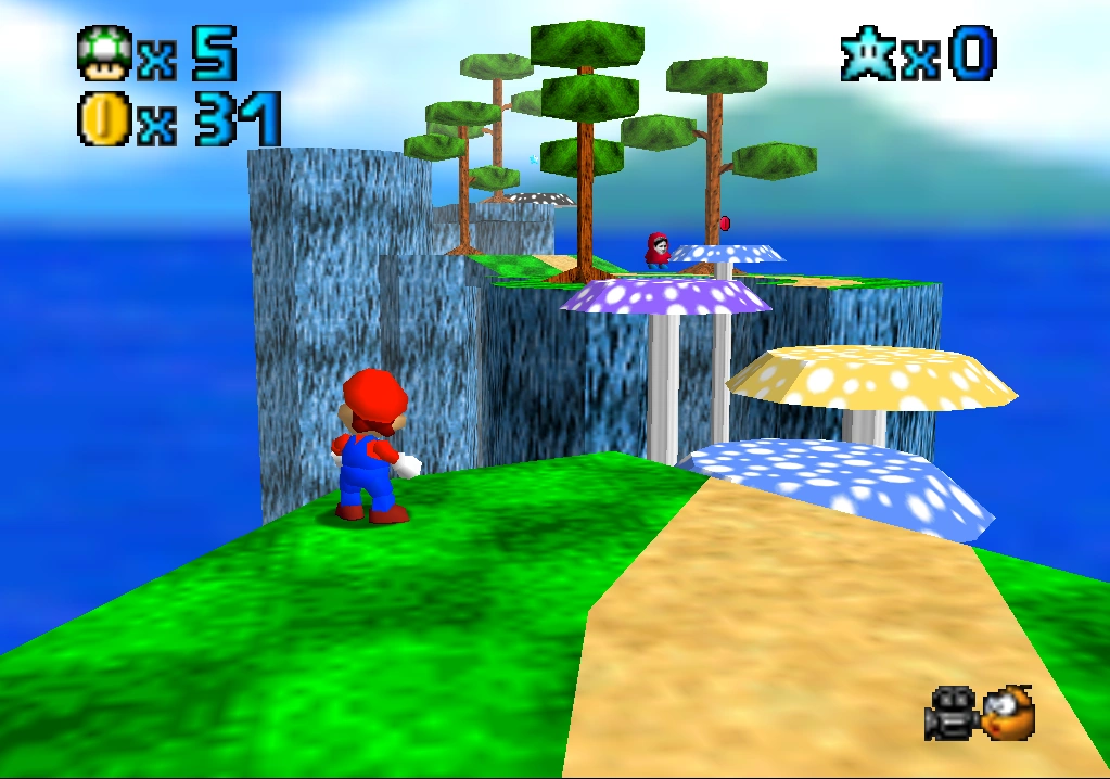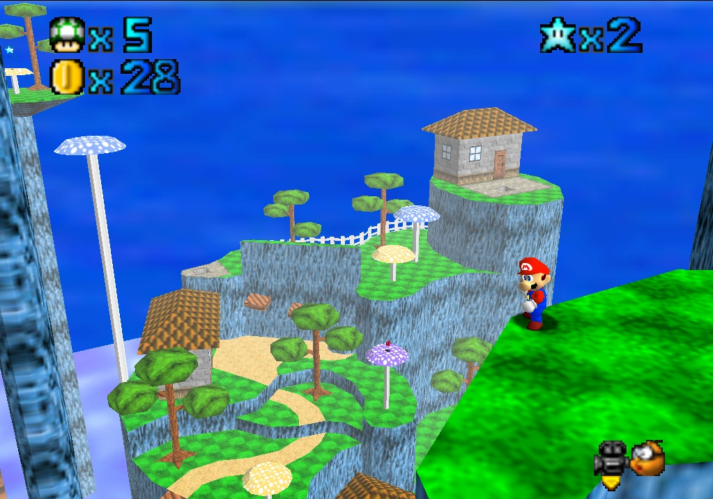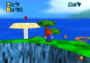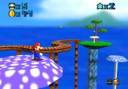 This course is a set of rocky mountains high in the sky, with village houses and shrooms scattered all over. Mario's starting point is near the bottom of the course, in the midst of a small village. From there, the most obvious route forwards is by platforming across the wooden bridges* directly ahead of his starting point, which will lead him round to the higher village, to the right of Mario's starting point. This village will be referred to as the cannon village, for reasons described below.