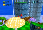 To reach the Wing Cap course, use the lower cannon in the cannon village to reach the lower area of the black shroom mountain. Head down the path going into the mountain, but instead, head straight for the cliff edge on the immediate left. Hidden just out of sight is a patch of red and white checkered grass. Standing on it will warp Mario to the top of the very highest mushroom in the course, atop which is a warp pipe leading to the Wing Cap course.