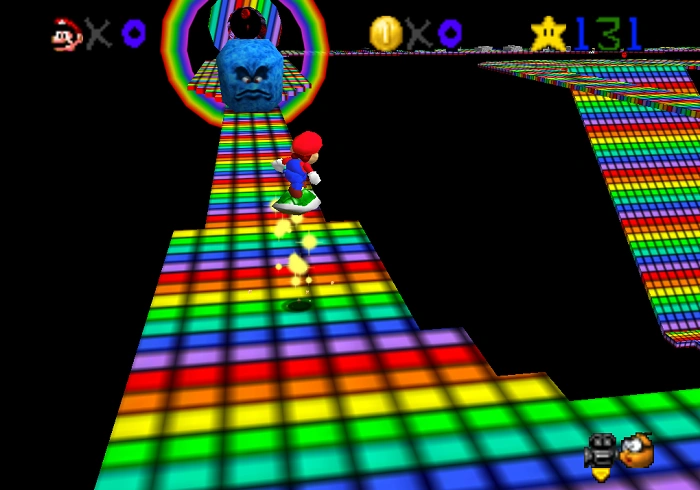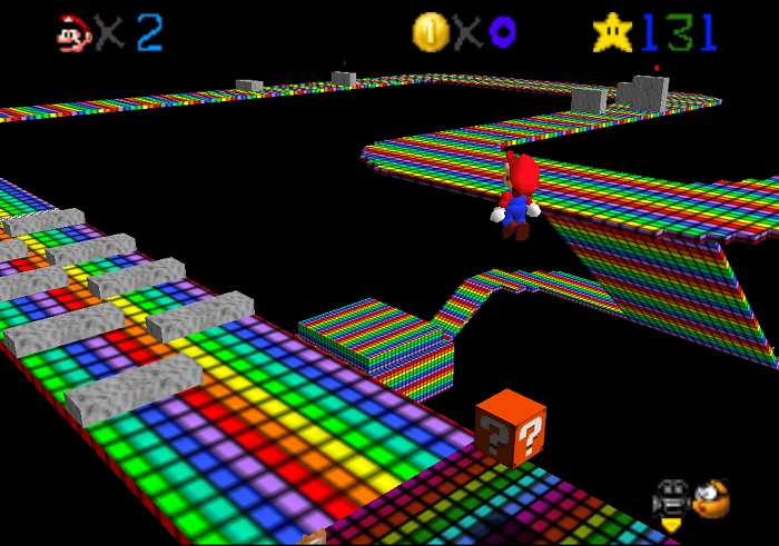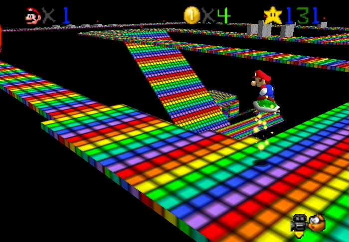 Rainbow Road is the one of the two secret stages in Super Mario New Star, that does not contain Bowser or a Cap Switch. The method to access this level is identical to how you access the Wing Cap in the original Mario 64. When in the interior of the castle, jump on top of the statue with the giant star. Stand on the randomly off-colored square and go into first person mode. Mario must look above the pipe leading to Darklight Cave near the highest point of the star. The stage itself is a slight redesign of the original Rainbow Road of Super Mario Kart, which must be navigated using a shell instead of a kart. It is a pretty straightforward track, with a couple of Thwomps and grey blocks (which represent other racers) in the way. The bright rainbow after the starting platform is all quicksand (or mud, as the sign says). This version adds two new features. The first being a small safe house on the bottom of a steep slope near the halfway point, as well as a tunnel which is used as a "shortcut"