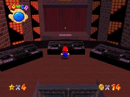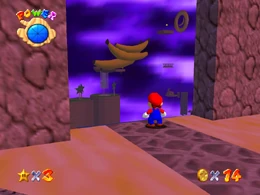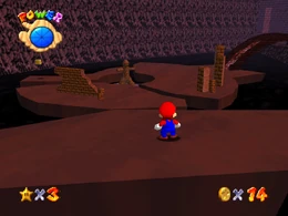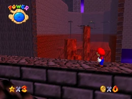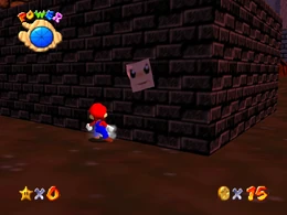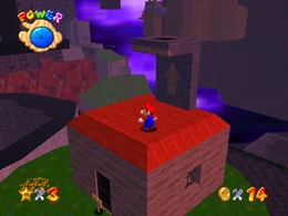 Inside the fake-cavern ahead is some ruins. Head over to the castle over bridge. Climb up the spiral staircase in the tower, then jump onto the roof, and onto the lit-up ledge nearby. Wallkick up to the top of the wall and run up the slope, towards the skull-and-crossbones sign. Open the ! box and ride the Koopa shell across the quicksand. Take the right path at the crossroads, then dismount the Koopa shell on the platform ahead, and set up a good starting point for wallkicking.