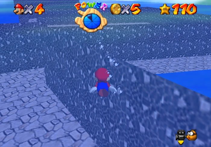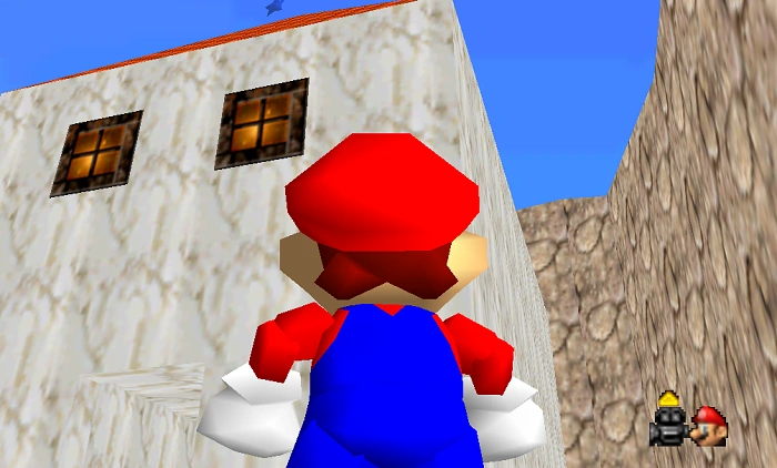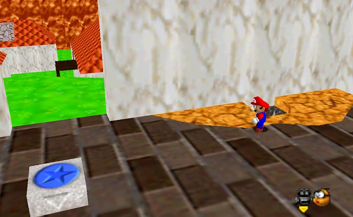 Mario must locate the entrance to the sewer system, which is a big hole to the left of the main path (directly across from the house with the sign). If you were to read the sign, it informs you of the BAD camera angle, which can easily result in drowning if you can not locate the other end, even though both paths are very simple (Dont worry, this is NOT a maze). The sewer system is laid out in a way that there are two different exits, on if you take the first left path, and one if you go straight. Enter the system and dive down and hug the left wall. The path is a left then another left turn (a "U" shapped). Once Mario surfaces, he must climb a spiral of block platforms, which can be done with a double jump or side flip. At the top there is a Koopa Troopa and the box with the star in it. IF you do not see these, you went through the other path accidentally.