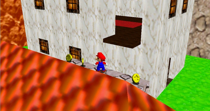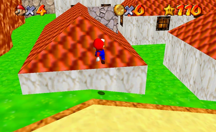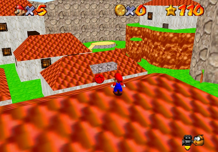 Mario stars on a small platform at the edge of the village. There is a sign directly next to him which reminds players how to use the zoom-in function to look around the area by wanting him to focus on a star on top of a roof. This is not the star in question, BUT the star is located on the second floor of that house. Mario needs to jump onto the shorter buildings and then jump into the upper entrance to the building mentioned previously. There are plenty of ways Mario can get to the rooftops of the houses. One involves jumping from the higher platforms which the wells lead to. Another involves triple jumping and grabbing the side of one of a wooden platform on the house next to it. And the last involves Wall kicking between the house with the star in it and the house next door to reach the star.
